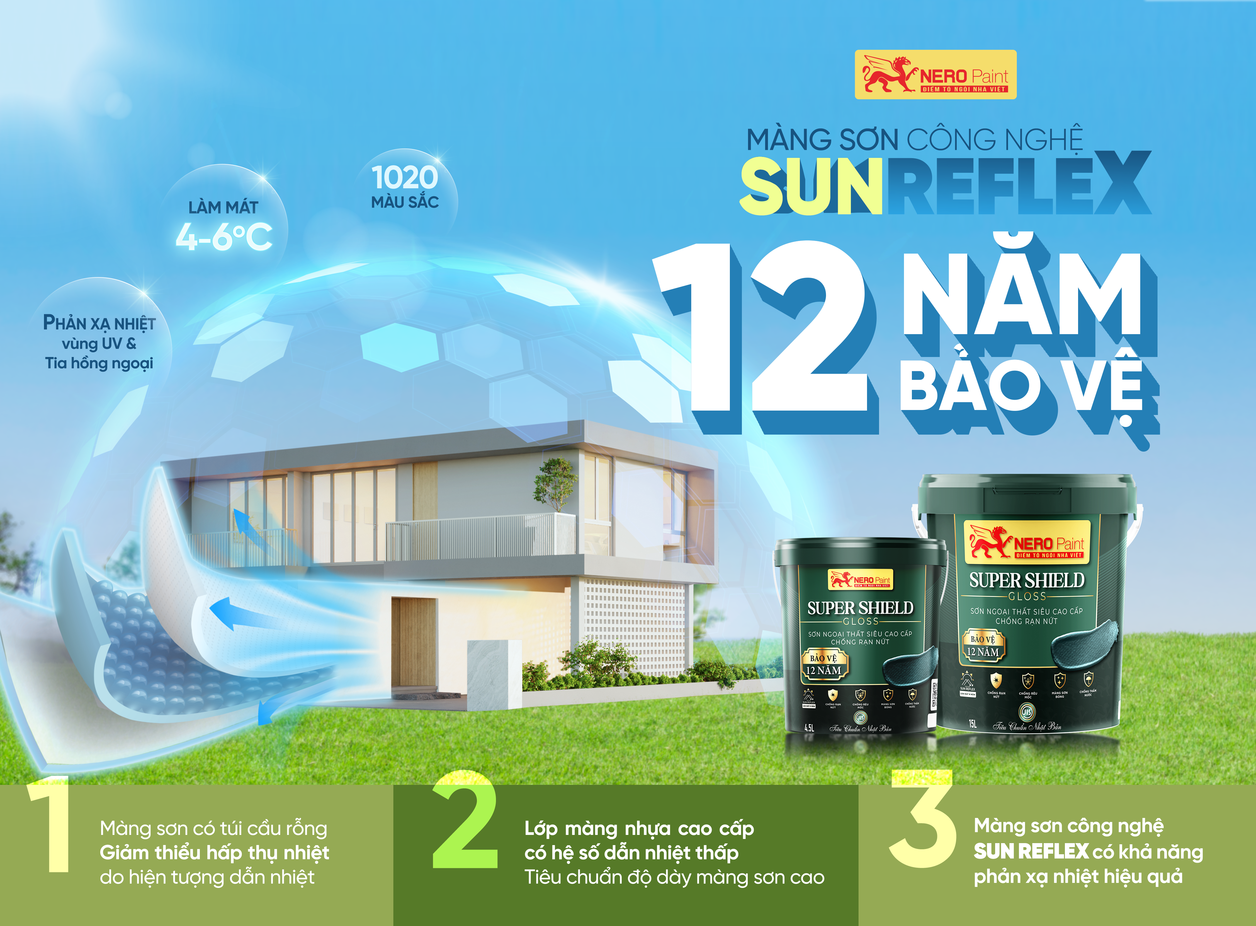 - Cùng với màng sơn co giãn tốt sơn Nero Super Shield Gloss còn có khả năng kháng UV rất cao kết hợp với công nghệ Sun Reflex bảo vệ cho tường nhà bạn bền đẹp và mát hơn dưới điều kiện khí hậu nhiệt đới.